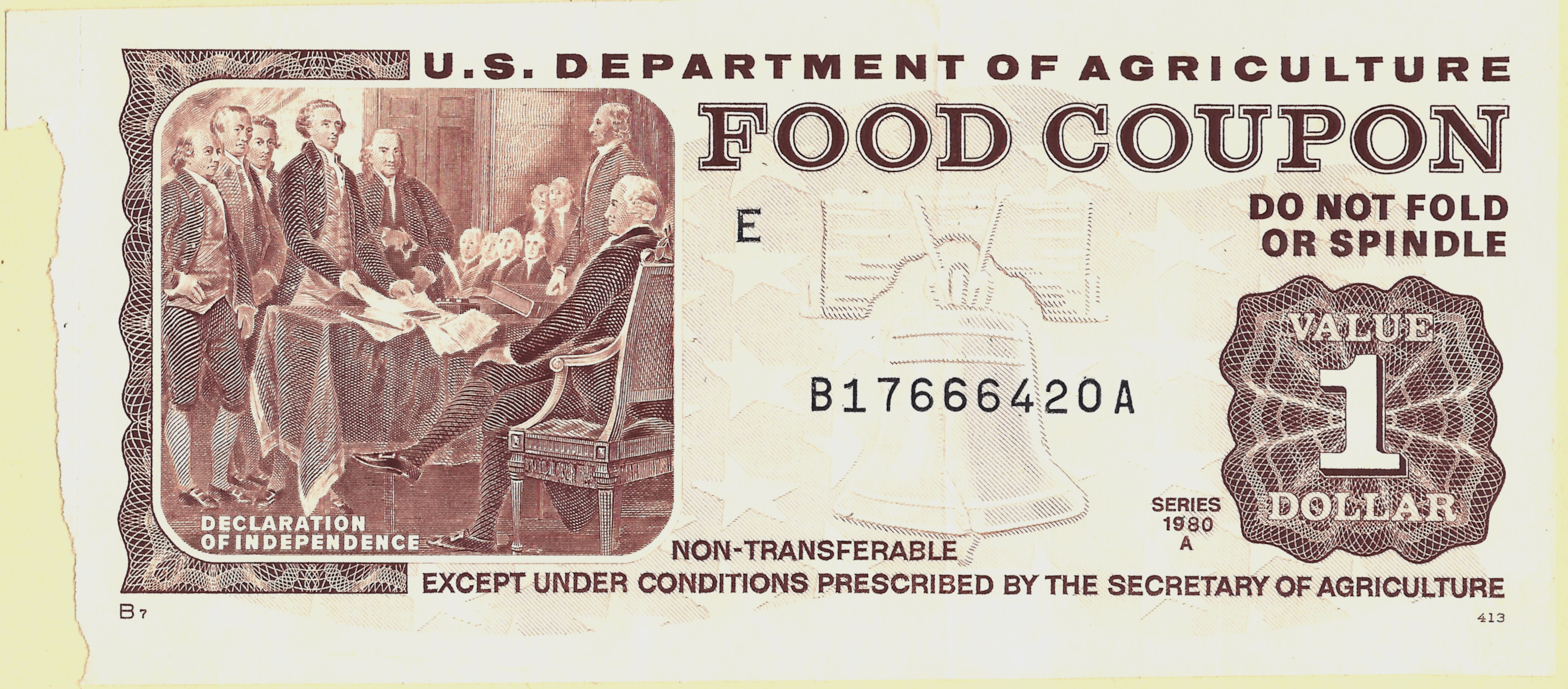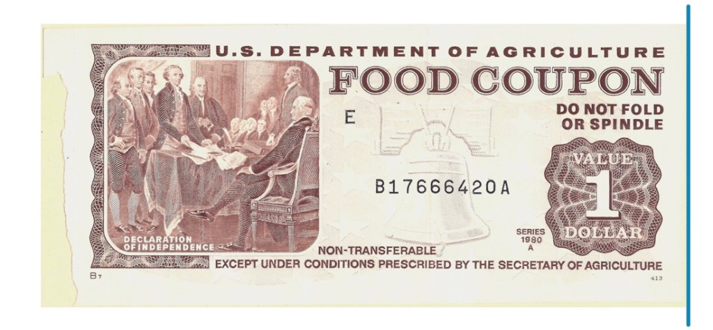 The food stamps, I am fairly sure, were mailed to us. This was back when food stamps were actually a book of “Food Coupons” with the likeness of our forefathers, in various colors representative of their value. They looked like Monopoly money to me, though they were much more valuable.