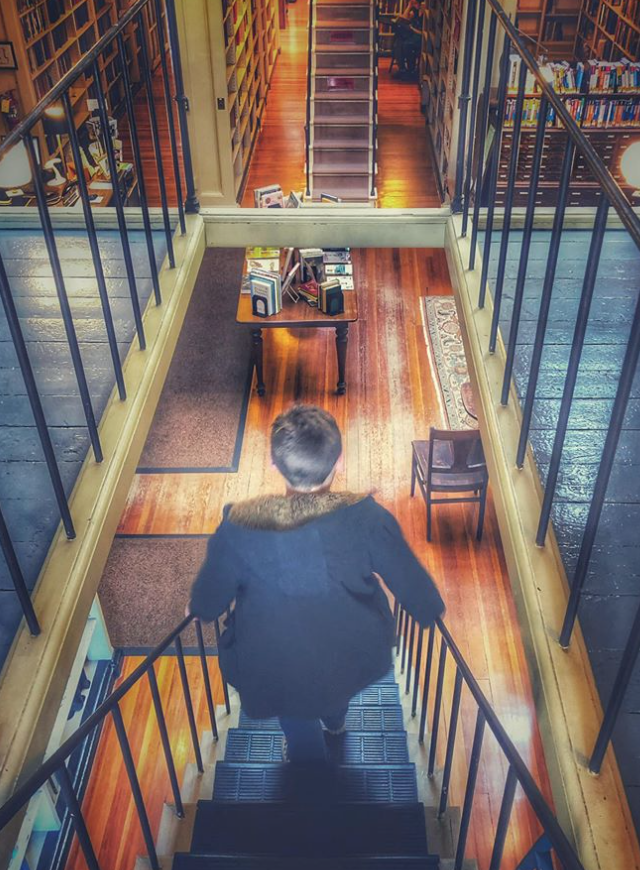 He really lucked out with creaky, old stairs and ladders all over this library!