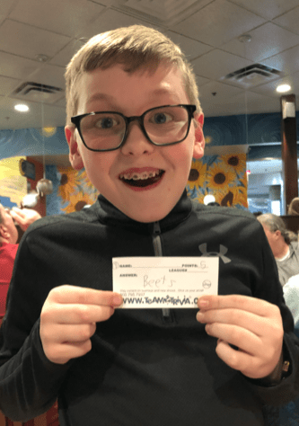 Jackson, Jerimiah, and I went to Mellow Mushroom on Tuesday night for Trivia Night. It’d been years since we last did it with friends in Charlotte, and we knew it was fun, so we kept meaning to go (the MM is like a mile from our house), but never made it a priority. We also weren’t sure if Jackson would like it or not, turns out yes, he does, and he even answered a couple of the questions himself. One of them was about The Office, which y’all know he loves, the question was: What is the primary crop that Dwight Schrute grows on his farm? Jackson freaked out and scribbled down: BEETS! The second one he got right was: Whose home, known as Mount Vernon, was neutral territory during the Civil War? “We’ve been there!” we all yelled, and he jotted down George Washington.