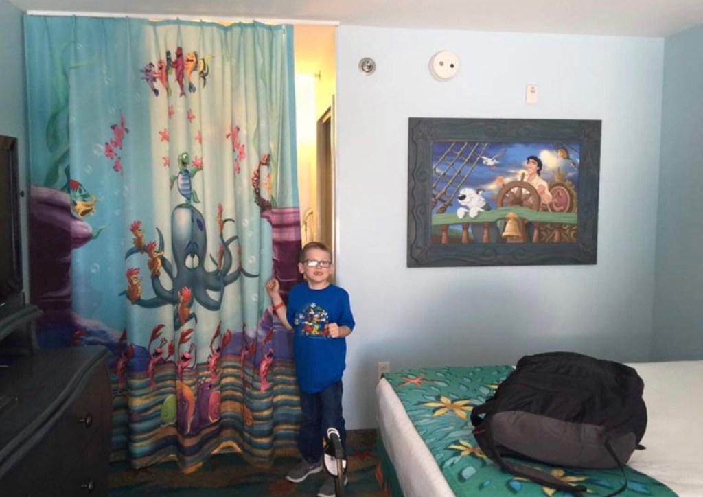 The next day we left Daytona bright and early and were in Orlando in no time. We checked into our hotel, one of the less expensive ones on the Disney property. We chose to go this route because you get extended hours to all the parks, and other perks, like a shuttle ride to the park. Plus, the package deals save you the most money and well, we are savvy shoppers. We ended up in a “Little Mermaid” room, which was ready and waiting for us super early that morning.