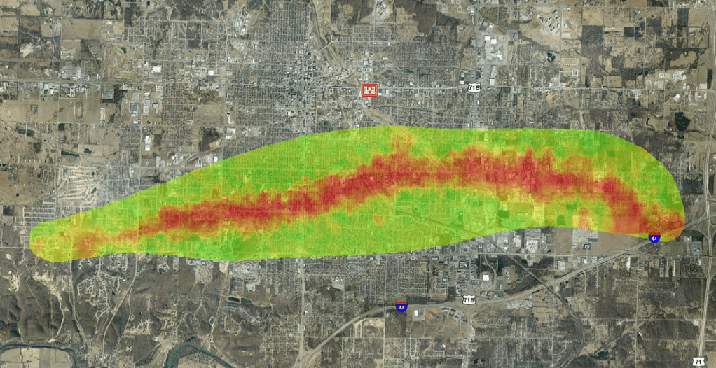 You might remember the catastrophic Joplin tornado. It was the seventh deadliest tornado in US history and the costliest single tornado at 2.8 billion. It started out as a small storm on the Kansas/Missouri border then turned slowly turned into the EF5 with over 200 mph winds. Here is a picture of the path to show its shear size from the Army Corp of Engineers.