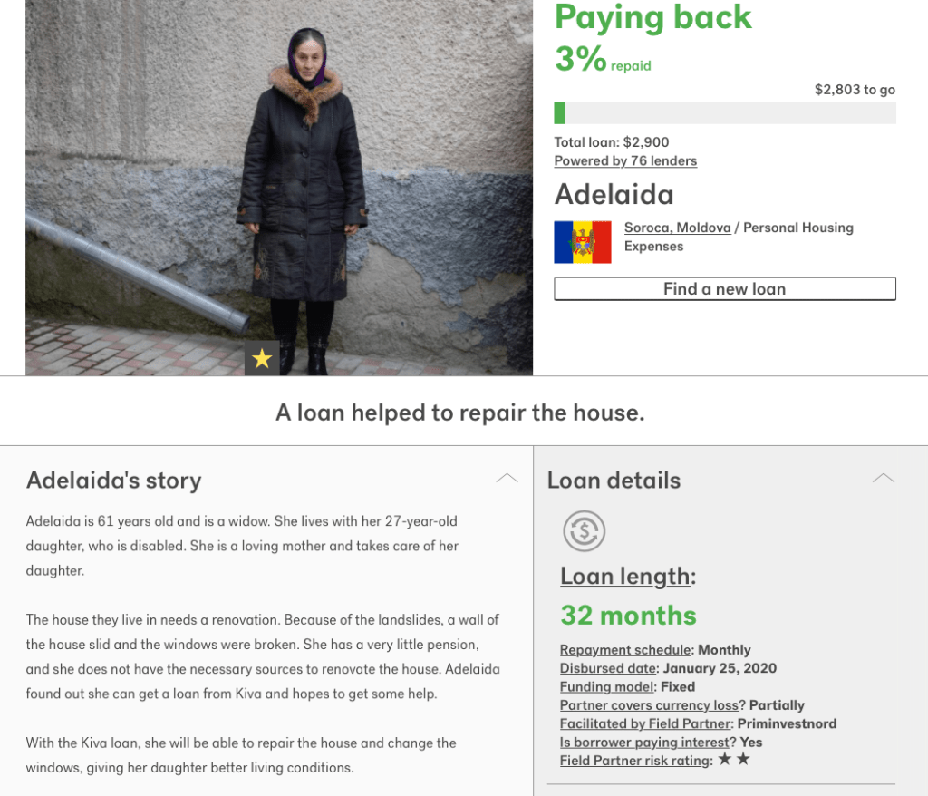 The second loan we gave out, also in the amount of $25, was to Adelaida in Moldova. She was was requesting a $2,900 loan to rebuild part of her house after a landslide. Here is a snapshot of what you see on Kiva.org: