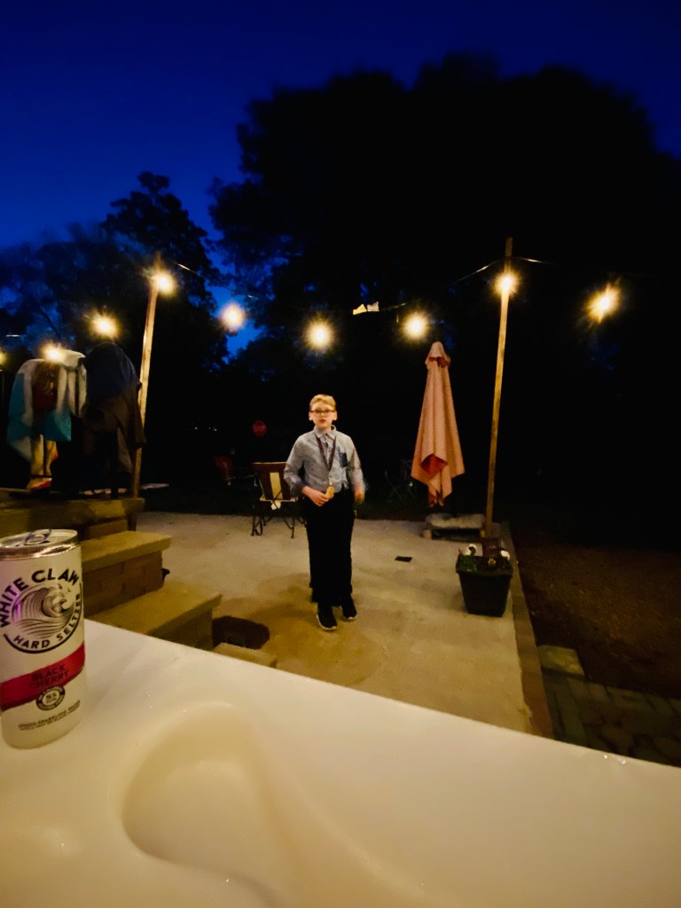 After we were all set up in the tent, we started making dinner. Grilled hamburgers and hot dogs, uh duh. Then ate on the deck. At this point it was in the mid-70s, sunny, and nice. We had big plans for the night that included a fire pit and the hot tub, so we were hoping it would cool down. Don’t worry, it did. It cooled way down.