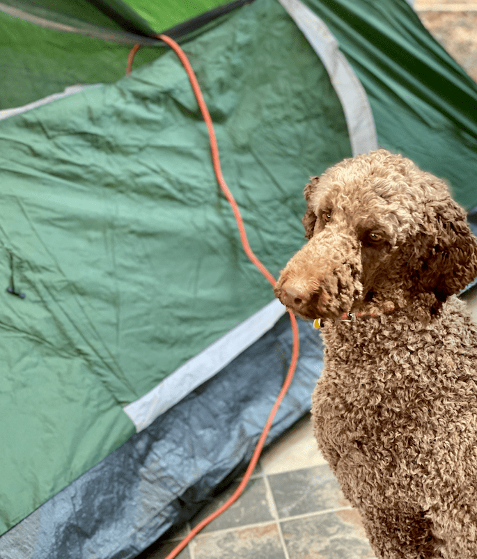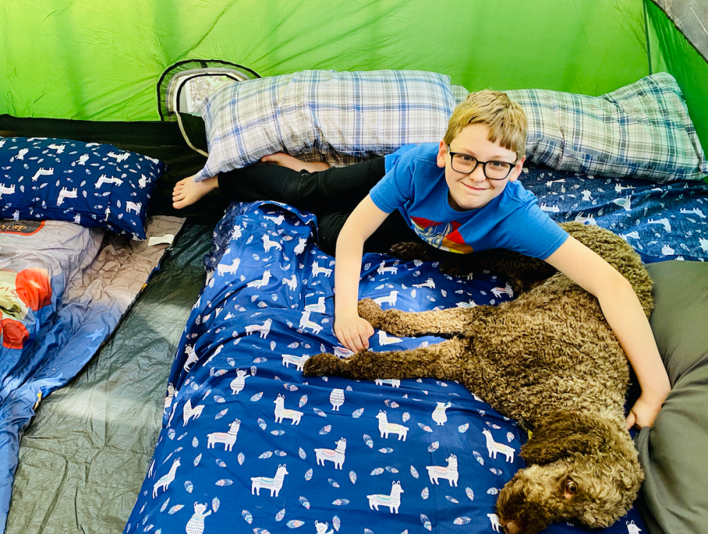 Afterward we got all cozied up inside the tent (well I did, with the dogs) and watched the At Home Edition of SNL, which was amazing! They did a great job. Then it was time for bed, so we all snuggled up for the night.