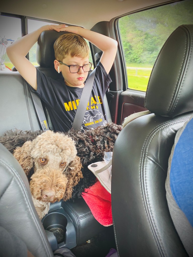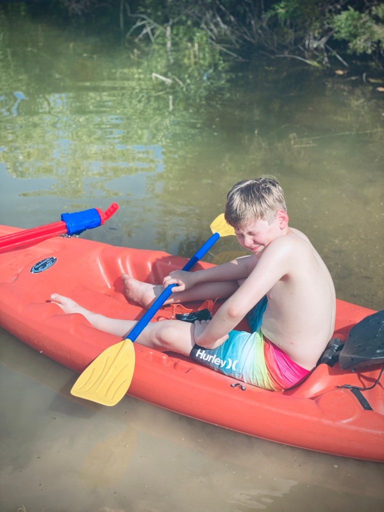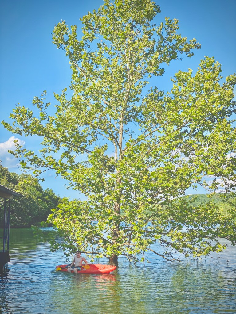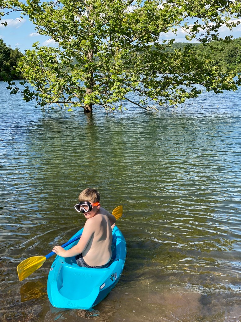Then there is the lake. It’s pretty high right now, and it’s recently turned over so there’s an occasional fish odor, but you know, that’s lake life. Still, Jackson and his buddy Tate have been kayaking up a storm!