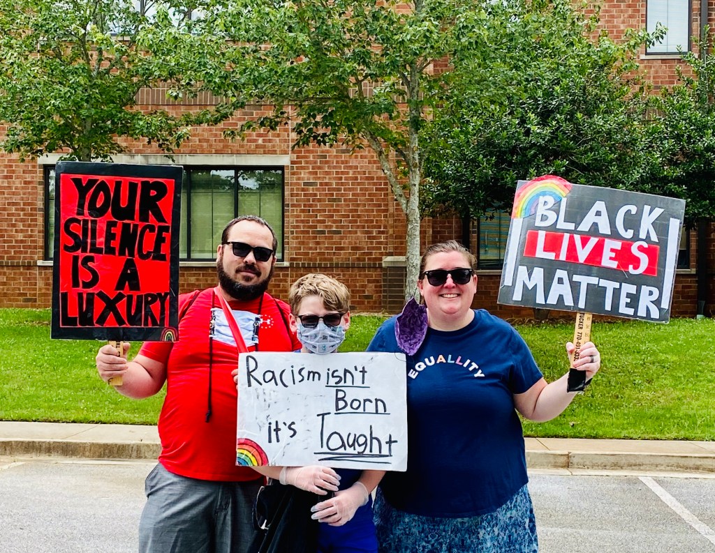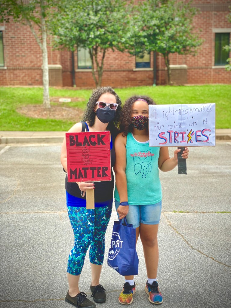 Last month Jerimiah, Jackson, and I took part in socially-distanced, peaceful protests in our suburban Atlanta town with our friends Kelley and Bella, and it was exactly what we needed to be doing. We met Kelley and Bella through school (Jackson and Bella were in the same class) and immediately felt connected to them. They are cool, too cool for us. They are kind. They are smart, and funny, and socially conscious. We feel so proud to call them friends, which is why the day we drove by (after getting ice cream) and saw them standing on the corner of Lavista and Main Streets with signs supporting the Black Lives Matter Movement, along with about 20 other people, we were like SIGN US UP! That sparked three days in a row of us standing on the same corner with our friends holding homemade signs (that we hastily made from material from The Dollar Tree), as well as taking part in a much larger protest on Saturday, June 6th with about 300 people. It was an amazing learning experience for the kids, for both good reasons and not so good ones.