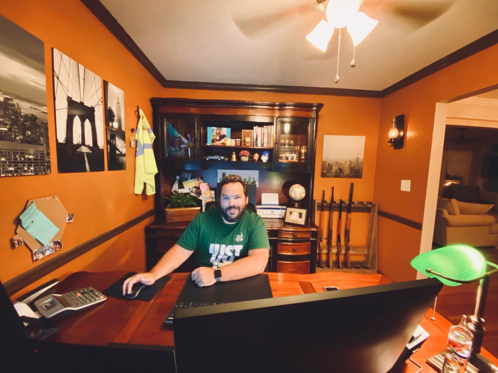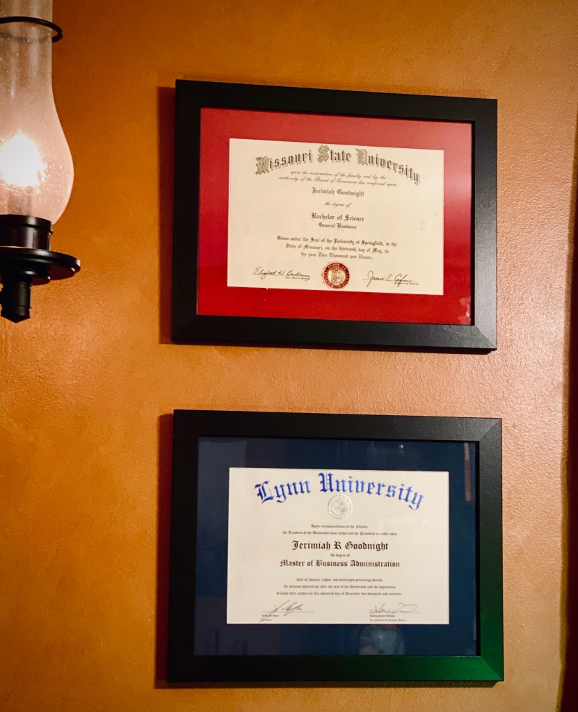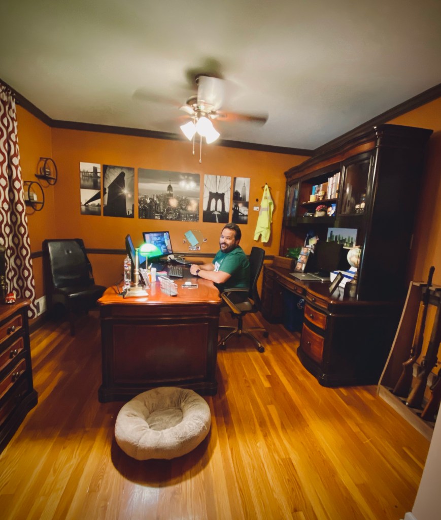 Meanwhile, I asked his mom if she would get him some new frames for his diplomas, something simple and tasteful to stick in his home office, which has been his only office for the last four months. Then I set to work on reorganizing the office. Trying to decide what a real “man’s” office should be. Whatever that is. Whatever that isn’t, and well, with our powers combined I think we pulled it off. What follows is the redecoration/reorganization of Jerimiah’s office, complete with the added gun rack, a bar, and of course a bankers lamp, because every Controller needs one of those.
