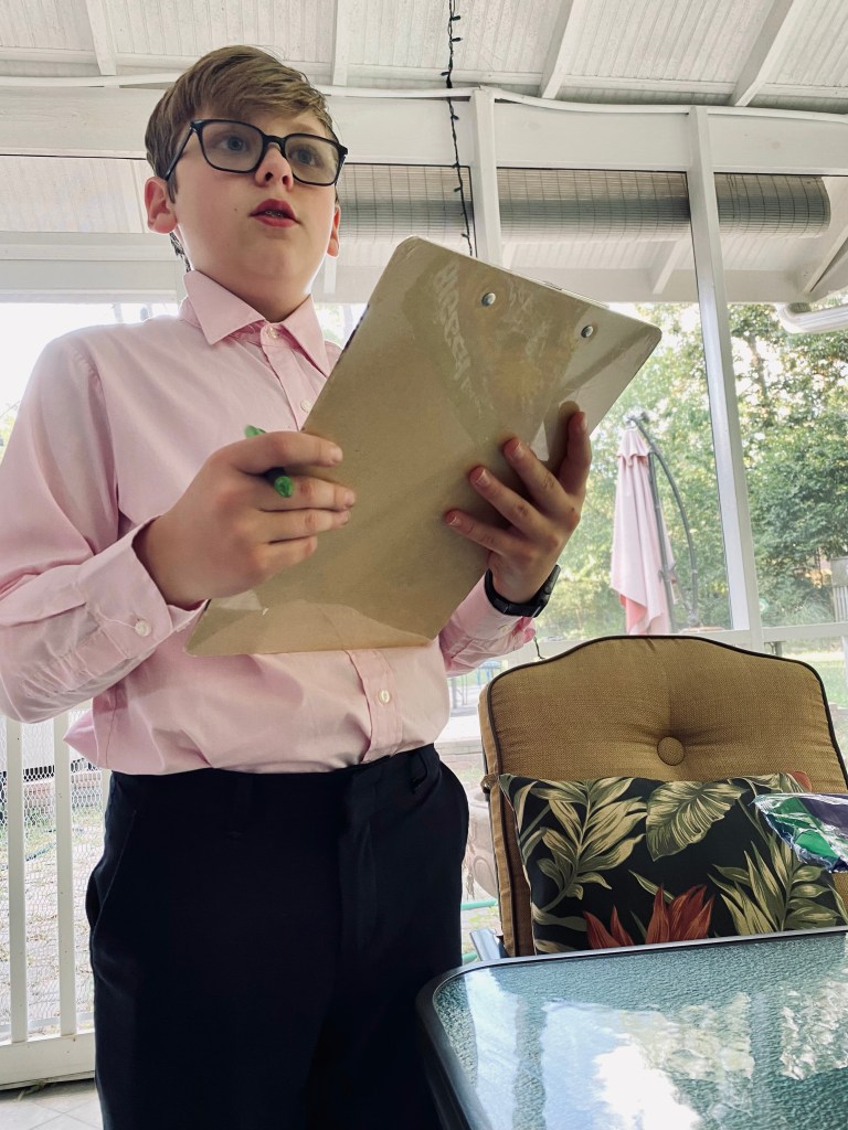 Jackson took his role as our server very seriously, as he usually does pretend play. He never once broke character, even allowing us to take our masks off only after I convinced him we were the only patrons of the restaurant. This was the note taped to our front door when I loaded Jerimiah up in the car (with the dogs) and drove up the road and back while Jackson “prepared” (got into a suit and character).