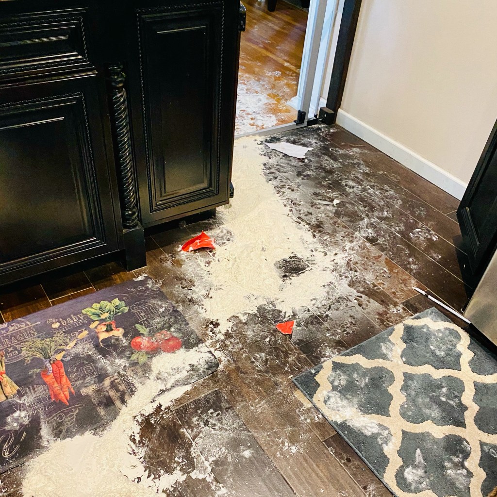 Not that we doubted for a second who the culprit was, it was nice to have the proof. She also had white paws, and clumps of flour all over her chin and chest because at some point she got thirsty, probably all the flour, and mixed water with the flour which, if you can imagine, was no fun to scrub off the floor.