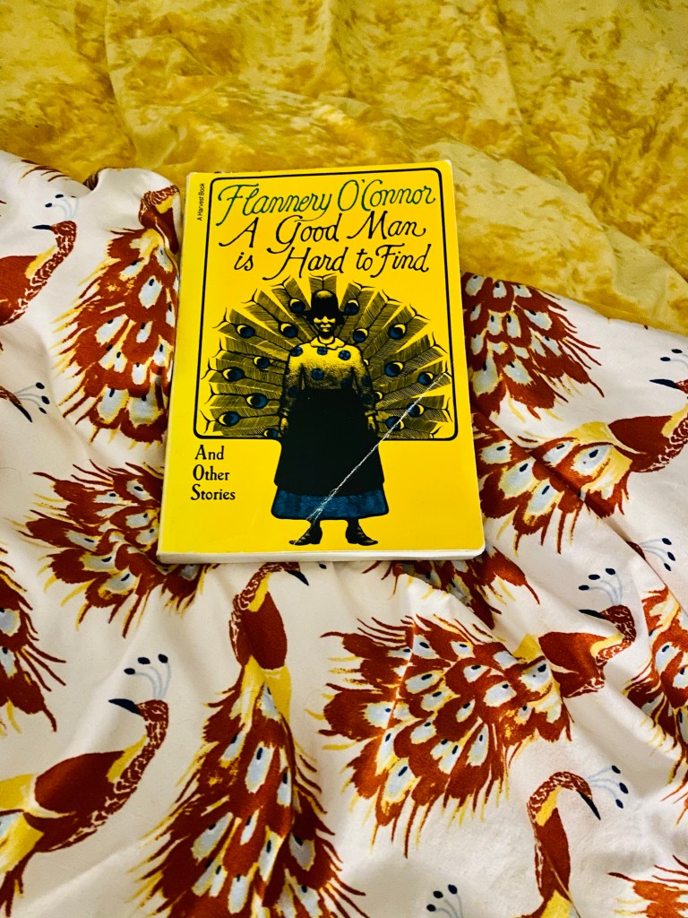 I’m surrounded by dog farts and peacocks. To be clear, they aren’t actual peacocks (I’m not a fan) but rather representational peacocks. To be crystal clear, the dogs farts are real, not representational and quite abundant. I’m reading Flannery O’Conner (yes, again, or rather, still) with a highlighter, in bed, under my blanket that mysteriously matches “A Good Man is Hard to Find and Other Stories” (A Harvest Book edition). So mysterious. And my poodle is on the end of the bed farting because, and I think this is the correct answer, he hates me.