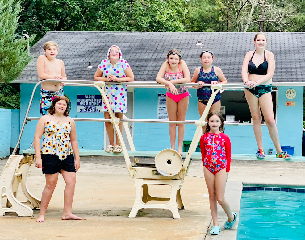 The pool is a relatively “low risk” outdoor adventure. You are basically swimming in bleach, and generally, generally the kids can maintain a safe distance. Though this “pool crew” is all really good about not going places, and all these kids take Covid-19 very seriously. You know you found your people, for instance, when one of them have a dog named “Bernie Sanders.” 🙂