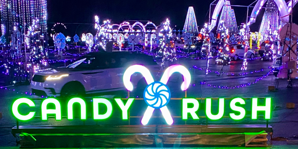 It was my mom’s second time at a drive-thru lights display. We took her to one way back in the day in Branson, Missouri. A place called Shepherd of the Hills does a little one every year and she enjoyed that one so we thought we’d take her to a larger one. As far as drive-thru light displays go, they are better when they have a theme and this one had a theme: Candy Rush. So all the lights were different kinds of sweets. Enough to give you a heart attack! But like others the lights flashed and swirled to the beat of the music, which was tuned in on 87.9 FM. My mom thought that was pretty cool too.